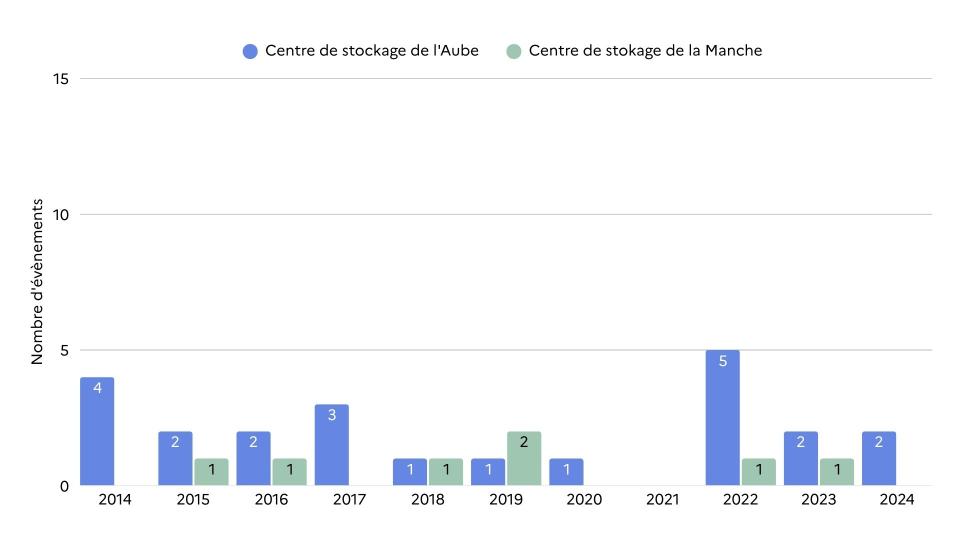 Depuis plusieurs années, les événements significatifs déclarés par l’Andra pour les deux installations INB qu’elle exploite1 sont de niveau 0. Ils sont listés dans le rapport annuel grand public de chaque site et sont présentés, conjointement avec l’ASNR, à chaque Commission locale d’information (Cli). En 2024, le Centre de stockage de la Manche n'a déclaré aucun événement significatif, tandis que le Centre de stockage de l'Aube en a déclaré 2.