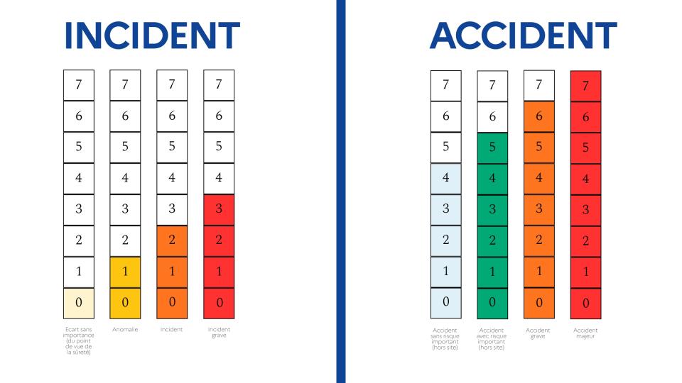 Il s’agit des écarts, anomalies, incidents ou accidents susceptibles de porter atteinte à la radioprotection des personnes, à la sûreté des installations, à la protection de l’environnement ou encore au transport de matières dangereuses. Leur gravité est évaluée selon l’échelle internationale INES1, qui les classe en sept niveaux allant d’un écart sans importance du point de vue de la sûreté (niveau 0) jusqu’à un accident majeur (niveau 7) comme celui de la centrale nucléaire de Fukushima (Japon) en mars 2011 et de celle de Tchernobyl (Ukraine) en avril 1986.